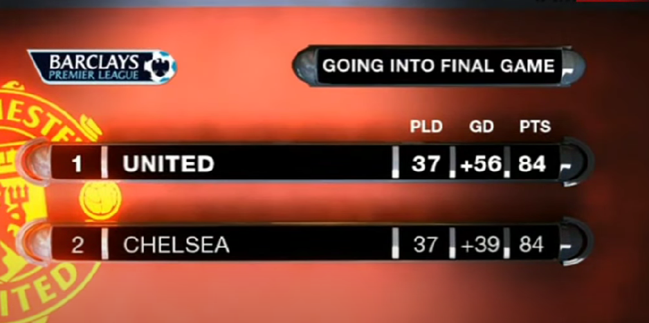 Chelsea und Man United haben sich über 10 Monate einen erbitterten Kampf geliefert und liegen nach 37 Spieltag mit jeweils 84 Punkten gleichauf im Meisterschaftskampf, mit dem kleinen Unterscheid, dass United eine um 17 Tore bessere Tordifferenz besitzt. Somit ist klar, dass Chelsea darauf hoffen muss, dass die Red Devils Punkte lassen.