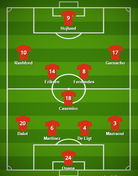 Mazraoui, Garnacho und Amad verpassten zwar die Länderspiele für ihre Nationen, haben jedoch diese Woche wieder trainiert und sollten deshalb morgen einsatzbereit sein. Fraglich ist jedoch Manuel Ugarte, der sich bei Uruguay eine leichte Blessur abholte und angeschlagen in das Wochenende geht. Malacia und Shaw nähern sich der Rückkehr, werden aber morgen noch nicht dabei sein, ebenso wie das englische Trio um Mount, Mainoo und Maguire, die noch länger ausfallen werden.