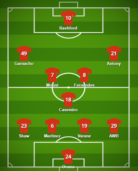Morgen werden nur zwei unserer Neuzugänge beginnen können, da Rasmus Hojlund mit einer Rückenverletzung nach Manchester gewechselt ist und wohl erst im September zu seinem Debüt kommen kann. Andre Onana, unsere erste neue Nummer 1 seit 2011, wird dafür im Tor starten, allerdings fehlen Tom Heaton und Dean Henderson verletzt, womit unklar ist, welcher zweiter Torwart auf der Bank sitzen wird. Neben den beiden Ersatzgoalies werden morgen auch Tyrell Malacia, der die komplette Vorbereitung verpasst hat, fehlen sowie auch Kobbie Mainoo und Amad Diallo, die aufgrund von Verletzungen aus der Pre-Season einige Wochen ausfallen. Somit ist die einzige knifflige Entscheidung für ETH, welchen Dreiersturm er aufstellt, wobei neben den gesetzten Rashford und Antony wohl Garnacho und Sancho um den letzten Platz kämpfen.