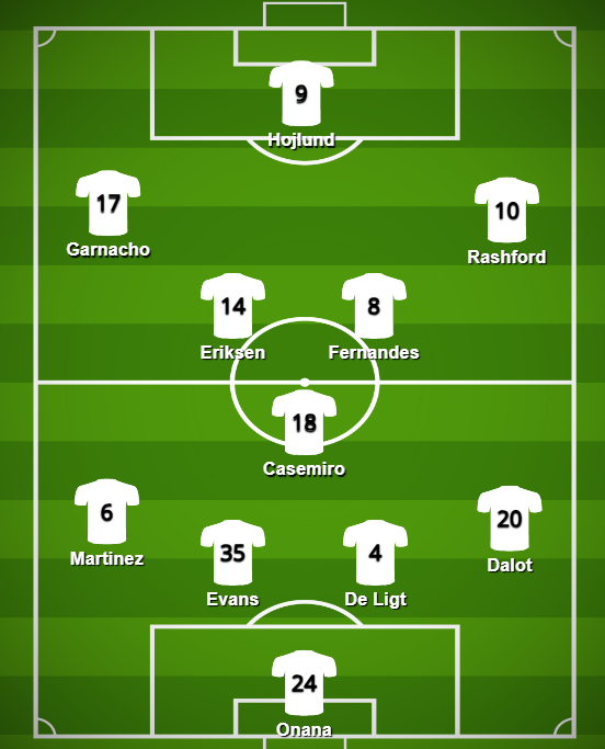 Mit Yoro, Malacia, Shaw, Maguire, Mainoo und Mount sind sechs Spieler langzeitverletzt, zudem wird befürchtet, dass sich Antony in Istanbul eine schwere Verletzung zugezogen hat, da der Brasilianer das Stadion nur auf Krücken verlassen konnte. Dafür sollte neben Kapitän Bruno Fernandes, der in der Türkei gesperrt fehlte, auch Jonny Evans ziurückkehren, der die Auswärtsreise mit einer leichten Blessur verpasste.