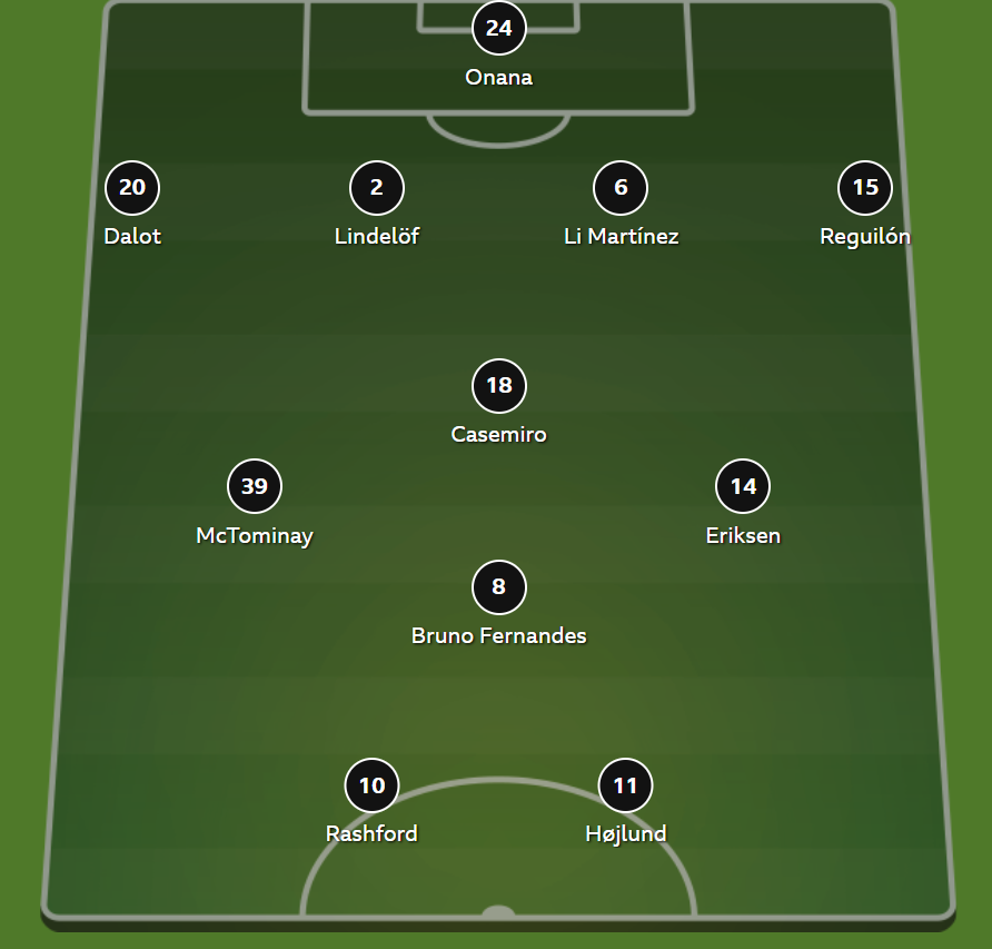 Ten Hag krempelte im Vergleich zum unglücklichen 1:3 bei Arsenal die Startelf um und brachte mit Hojlund, McTominay, Dalot und Reguilon vier neue Spieler. Bruno wurde dabei auf dem rechten Flügel erwartet, United spielte allerdings früh sichtbar in einem 4-1-2-1-2 mit Rashford und Hojlund als Doppelspitze.